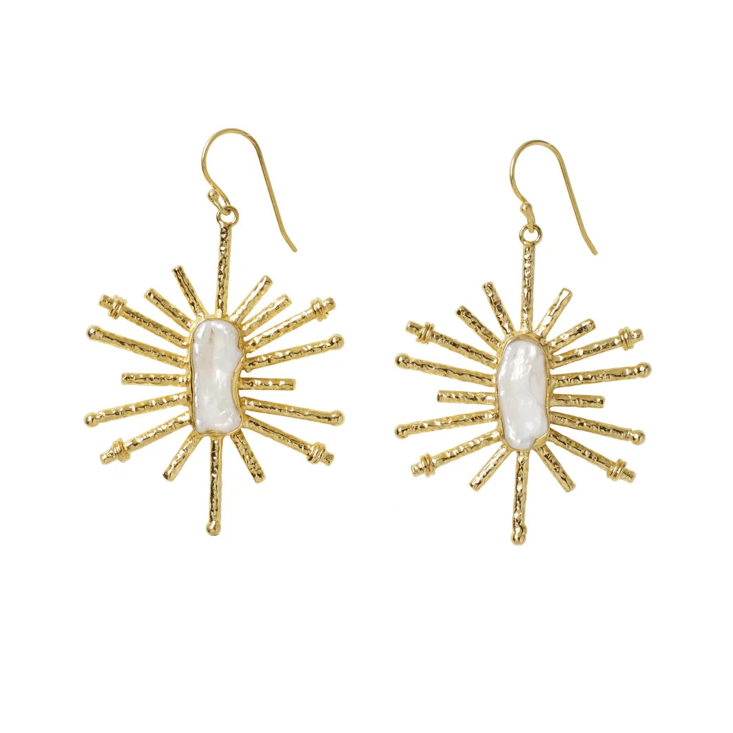 Make a bold statement with our Irregular Pearl Gold Sparkle Statement Earrings! These stunning earrings feature a unique irregular shape and a shimmering gold finish that will catch everyone's eye. The white pearl accent adds a touch of elegance to any outfit. Perfect for adding some sparkle to your accessory collection! These earrings will arrive in a YAA YAA LONDON Gift box. Materials: 18k gold plating, brass, mother of pearl Size: 6cm x 4cm
