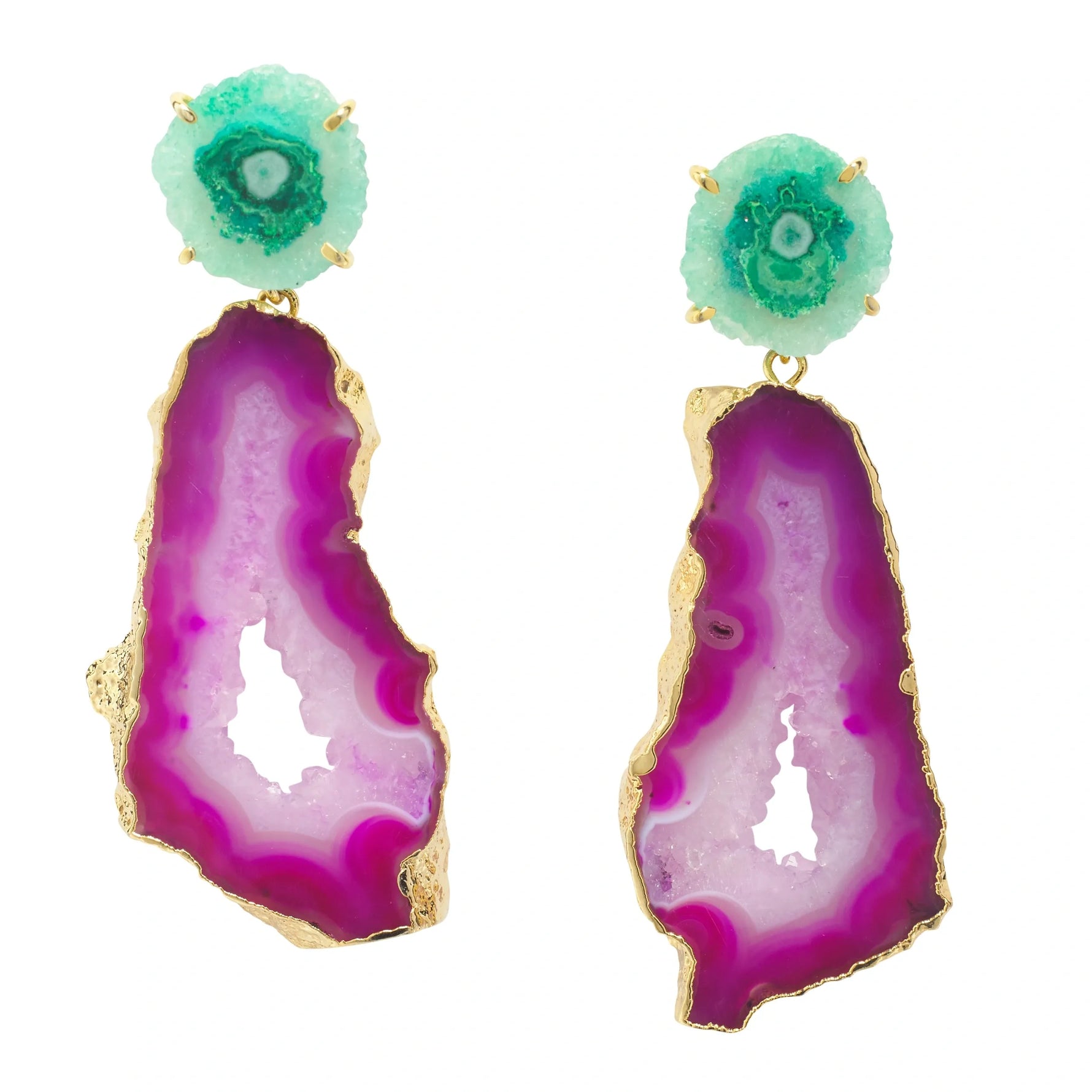 Unit price perThe stunning hues of green and purple / fuchsia pink and white agate semi-precious stone showing its druzy crystals is simply captivating. No two pairs of earrings are exactly the same so each pair of earrings is a real treasure. Colour intensities, shades, marking and sizing varies. Choose between a larger statement pair or a smaller style by adding details to your order notes. They will arrive in a YAA YAA LONDON jewellery box making them a great gift idea for yourself or somebody you love.
