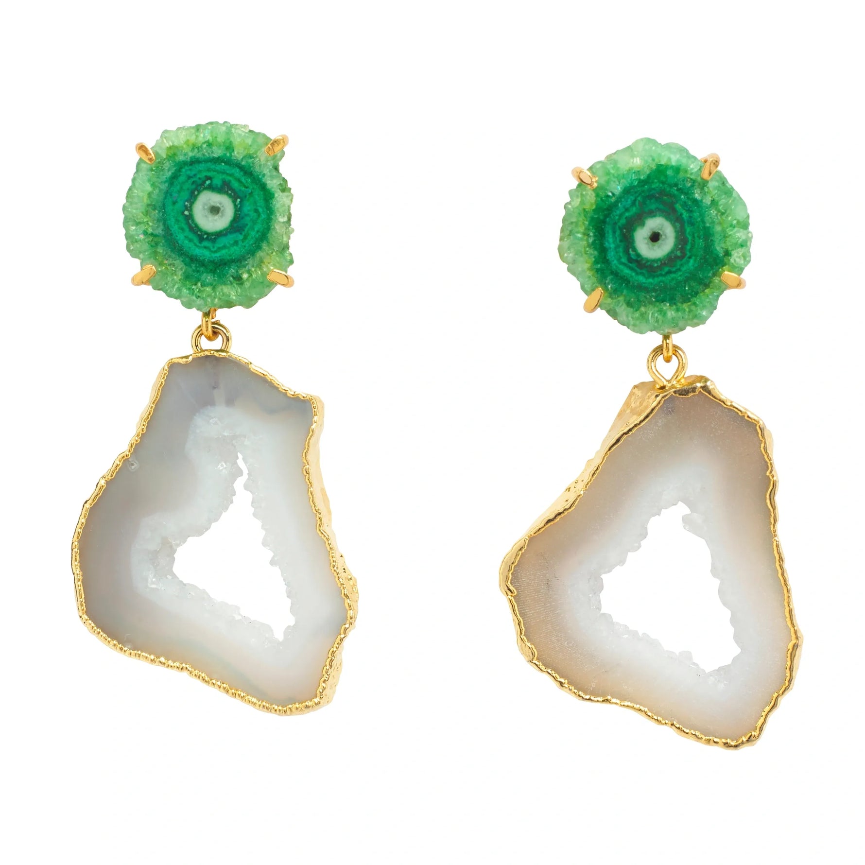 Unit price perIf you are looking for unique handmade earrings, look no further – because you have found them. The stunning pairing of white/grey agate semi-precious stone showing its druzy crystals is simply captivating. I have teamed it with beautiful green solar quartz (a YAA YAA LONDON classic) for added style credentials. No two pairs of earrings are exactly the same so each pair of earrings is a real treasure. Colour intensities, shades, marking and sizing varies. Choose between a larger statement pair or a smaller style by adding details to your order notes. They will arrive in a YAA YAA LONDON jewellery box making them a great gift idea for yourself or somebody you love. Materials: Solar quartz stoneAgate Stone18k Gold platingBrass MetalPlease note that earrings are not refundable for hygiene reasons. Thank you
