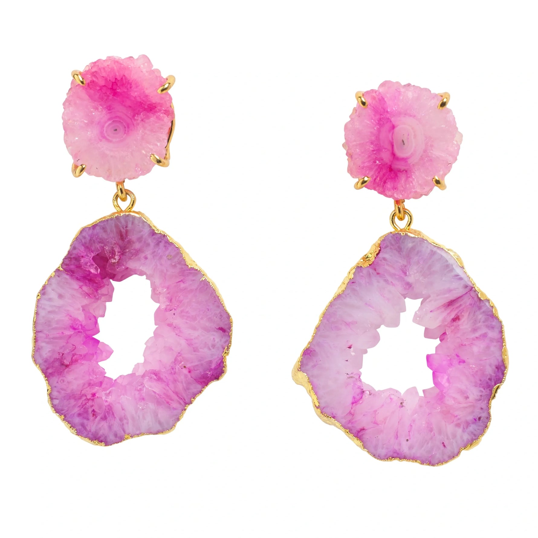 Unit price perIf you are looking for unique handmade earrings, look no further – because you have found them. The stunning hues of lilac, pink, violet, lavender, and white agate semi-precious stone showing its druzy crystals is simply captivating. I have teamed it with beautiful raw-cut solar quartz stone (a YAA YAA LONDON classic) for added style credentials. No two pairs of earrings are exactly the same so each pair of earrings is a real treasure. Colour intensities, shades, marking, and sizing vary. Choose between a larger statement pair or a smaller style by adding details to your order notes.