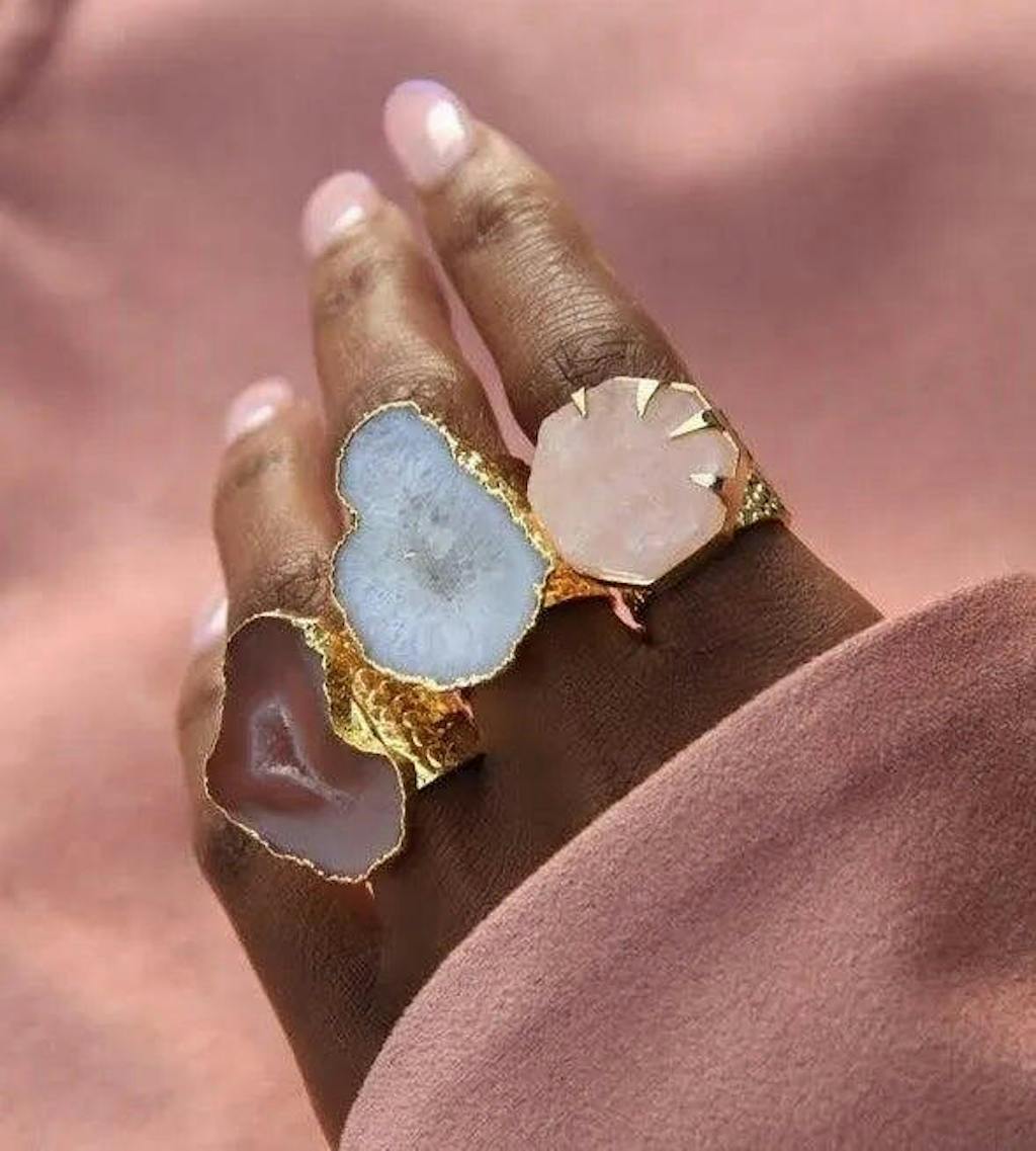 Unit price perYAA YAA LONDON handmade agate crystal gemstone statement rings from the ‘MEGA’ ring collection. Make some power-moves with these gorgeous rings, set in a demi-matt gold plated thick band and mounted with a natural white semi-precious gemstone. The colour intensities, stone sizes and shapes vary from ring to ring making each one unique. Other colours and styles available online and at selected YAA YAA LONDON stockists. This ring will arrive in a YAA YAA LONDON jewellery box. Other colours available online. Main materials: 18k Gold plating, brass, agate. Ring size: slightly adjustable, best suited for slim to medium-sized fingers. There is some adjustment in the metal to pinch the ring gently to make it a little smaller or slightly larger, but please note that this is a sturdy strong ring, made to support a large semi-precious stone. Average stone size: approx 2.5cm - 3cm long Ring Band Width: approx. 19mm at the widest point. Colour intensities, stone shapes, and sizes vary. Take care of your jewellery and keep it pretty