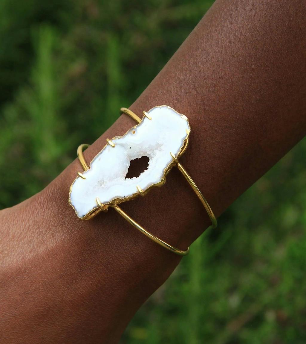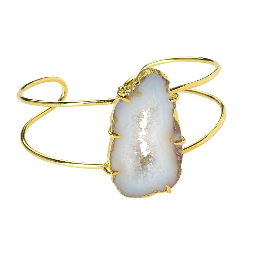 Unit price perGorgeous natural white agate gemstone cuff bracelet with shades of grey featuring a unique glossy agate semi-precious stone with crystal lining. At YAA YAA LONDON, we are passionate about colours and shapes that spread confidence and allow our community to dream without any limit. Following the success of our Love Collection earrings and necklaces, we felt it was time to adorn your wrists too. Each stone is unique in colour intensity, size and shape. If you have a specific request, please use the ‘Special Instructions’ box when you check out. Wear these cuff bracelets with a MEGA ring for a statement look. Each cuff bracelet will arrive in a YAA YAA LONDON jewellery box. Cuff size: adjustable Stone size: approx 3.5cm-5cm Materials: Agate, Brass, 18k gold plating