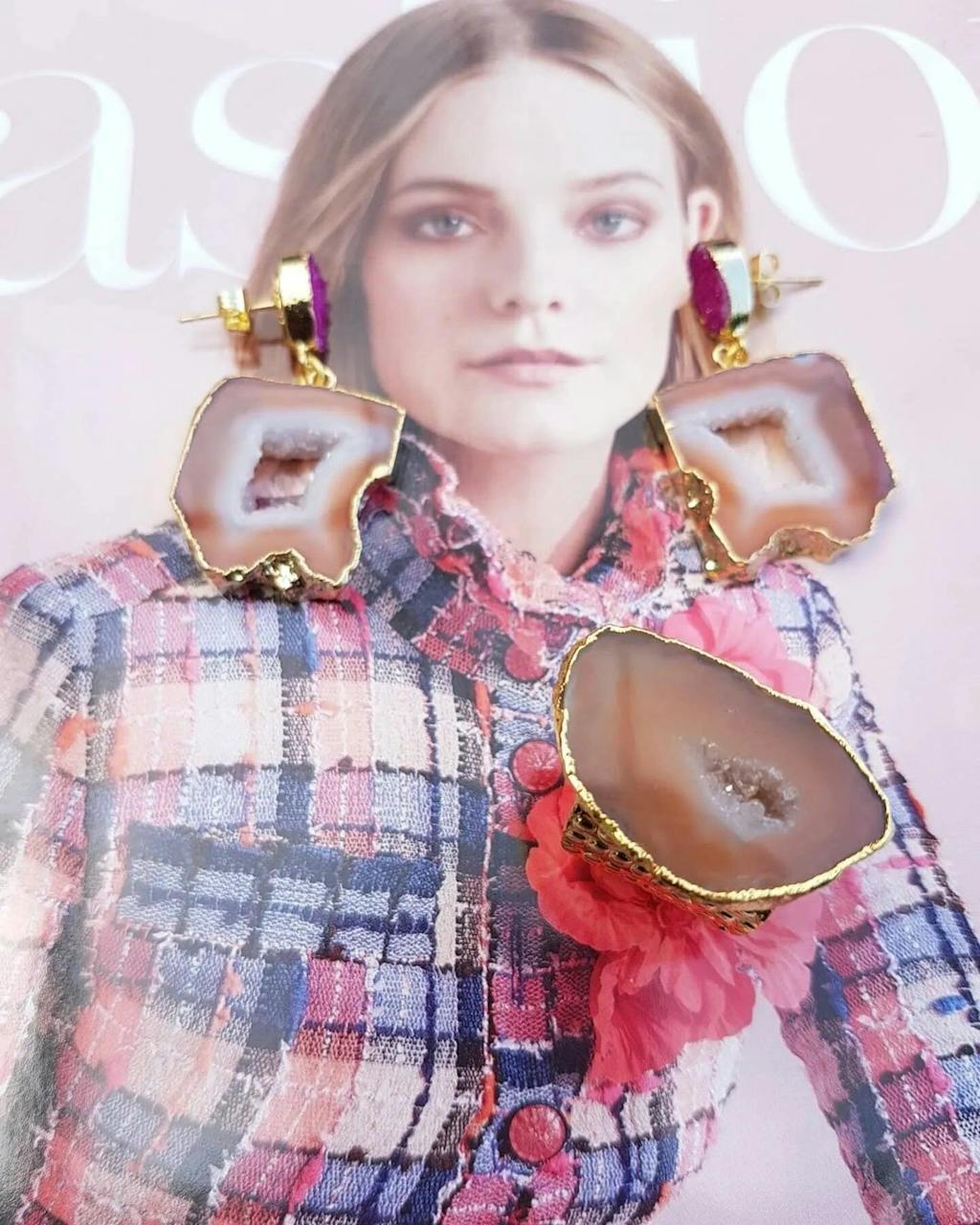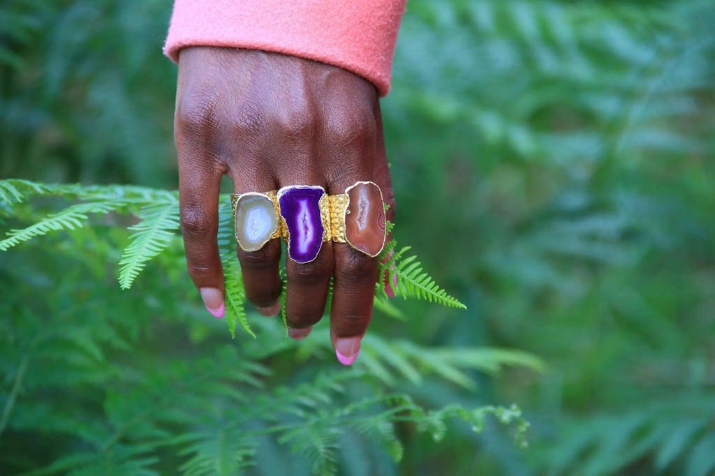 Unit price perNew handmade agate crystal gemstone statement rings set in a demi-matt gold plated thick band. The caramel, honey and tan shades of the natural stones are magnificent. Make some power moves with these gorgeously unique rings. The colour intensities, stone sizes and shapes vary from ring to ring making each one unique. Other colours and styles available online and at selected YAA YAA LONDON stockists. This ring will arrive in a YAA YAA LONDON jewellery box. Main materials: 18k gold plating, agate, brass Ring size: slightly adjustable and best suited for slim to medium sized fingers. There is some adjustment in the metal to pinch the ring gently to make it a little smaller or slightly larger, but please note that this is a sturdy strong ring, made to support a large semi-precious stone. Stone size: Average stone size: approx 2.5cm - 3cm long. You can request a smaller or larger stone size/shape in your order notes if you wish and we will do our best to accommodate that depending on stock levels Ring Band width: approx 19mm at the widest point Colour intensities, stone shapes and sizes vary. These are semi-precious stones. Take care of your jewellery and keep it pretty