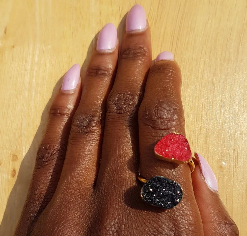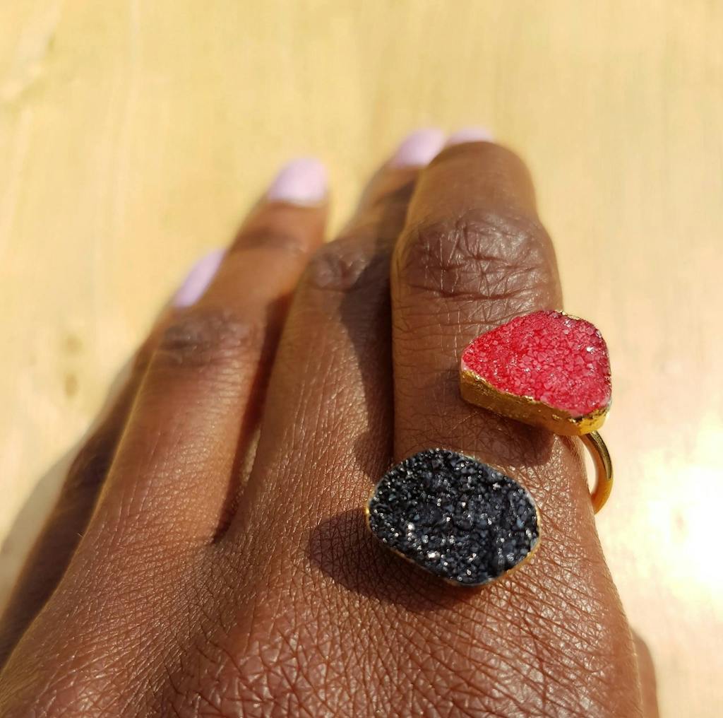 Glimmering Black and Red Druzy Agate Stone Semi-precious Gold Ring. The colour intensities and shapes vary from ring to ring making each item unique! A beautifully created ring at an affordable price bang on trend with this season's colour craze. This ring will arrive in a YAA YAA LONDON jewellery box. Main materials: druzy agate stone, gold plated base metal Size: one size fits all (slightly Adjustable) Average stone size: 1.5cm x 1 cm