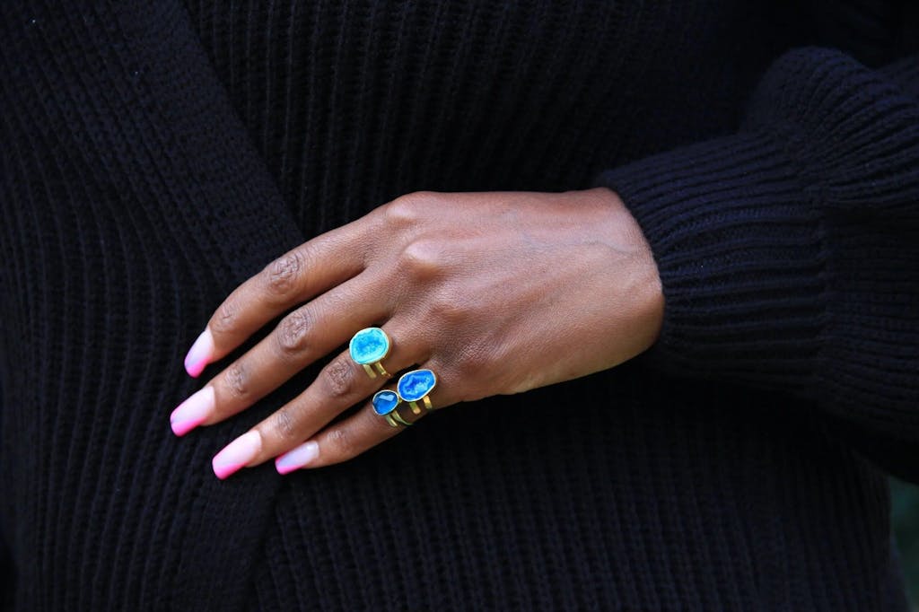 A stunning crystal 'pinky' ring in contrasting shades of electric blue agate geode and gold. Because no fingers should be left out. We've designed these handmade 14K gold vermeil rings to add an individual pop of colour to your littlest fingers. The precious metals hug the fingers comfortably and are easy to adjust. This Electric Blue irregular pinky ring features an electric blue and cobalt agate geode.