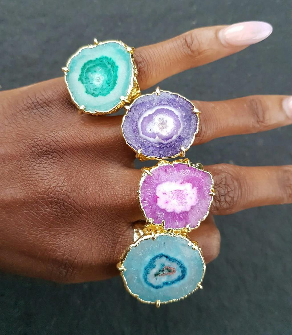 Unit price per**As seen in Good Housekeeping magazine** In hard times, power and strength are needed. These handmade pieces are intensely impactful and display the ever unique, ever changing solar quartz stone with its unique markings and hues of purple. These beautiful rings work well when teamed with YAA YAA LONDON & YYL LUXE collection earrings. The colour intensities, stone sizes and shapes vary from ring to ring making each one unique . Materials: Solar quartz stone, 18k gold plating, brass metal Ring size: slightly adjustable and best suited for slim to medium sized fingers. There is some adjustment in the metal to pinch the ring gently to make it a little smaller or slightly larger, but please note that this is a sturdy strong ring, made to support a large semi-precious stone. Colour intensities, stone shapes and sizes vary. These are semi-precious stones. Take care of your jewellery and keep it pretty