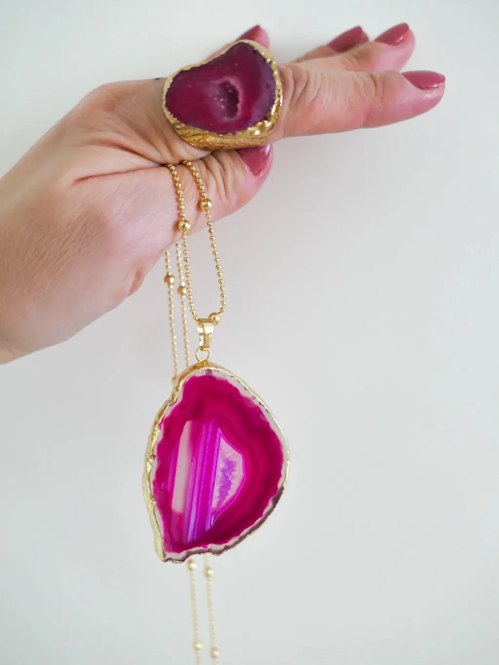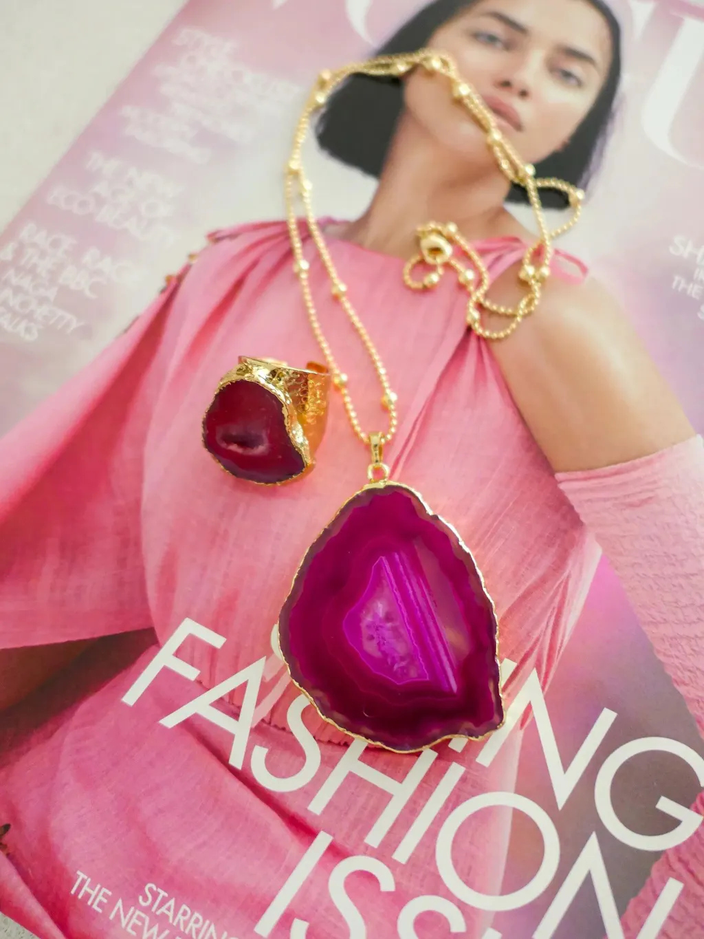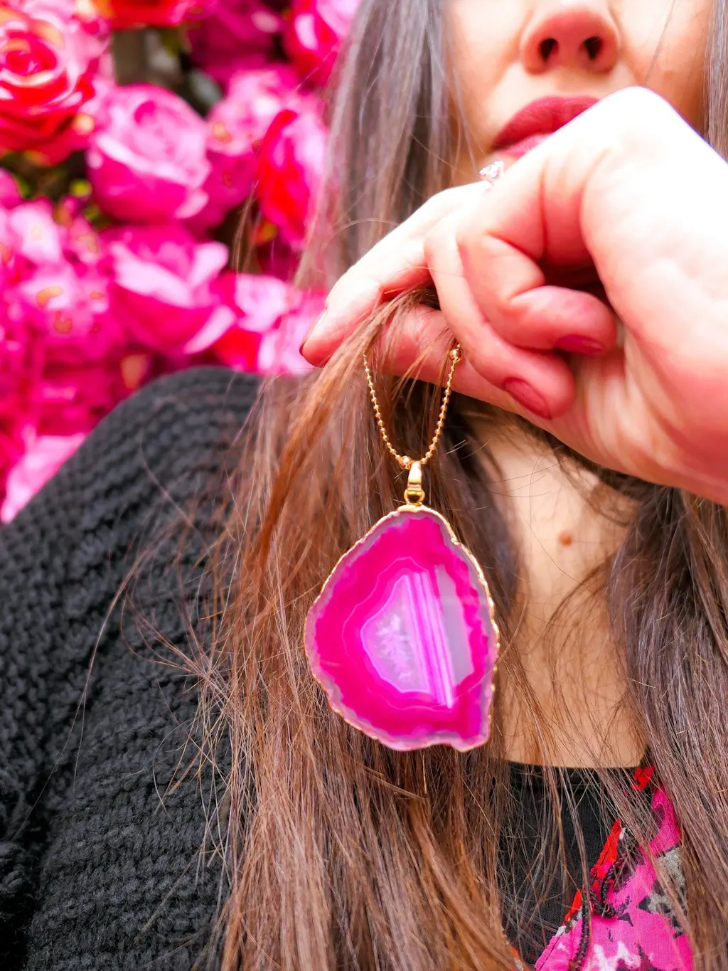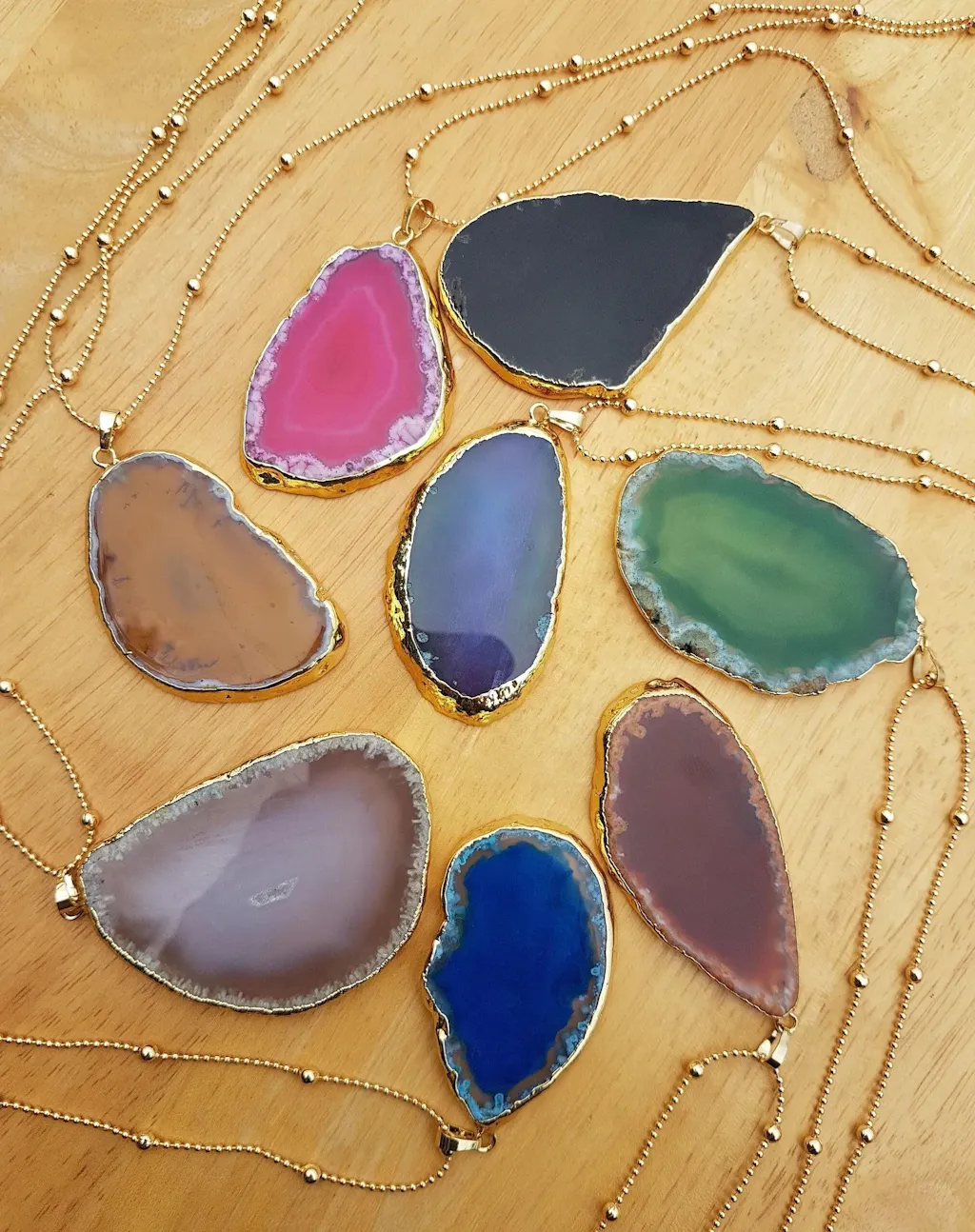 Unit price perZero calories per slice! Gorgeously unique pink agate slice long gold necklace on a stunning beaded gold long-line chain. These necklaces are perfect for layering with your existing wardrobe and jewellery. No two gemstones are the same so whichever you choose to buy is a treasure to have and hold on to. I have designed these necklaces to be large enough to put over your head easily. Your necklace will arrive in a YAA YAA LONDON gift box, ready to treat yourself or someone you love. Other colours available online. Materials: Agate, Gold, Copper, Brass Chain length: approximately 25 inches Pendant size and shape: pendants sizes vary – average stone size 2.5 inches x 1.5 inches